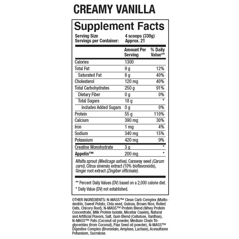 N-MASS™ provides a convenient way to consume 1,300 high quality calories derived from 55g protein, 250g of carbohydrates and 9g fat; with added creatine monohydrate and Appelin™ in every serving. Nothing will fuel your workout recovery and trigger muscle growth faster!