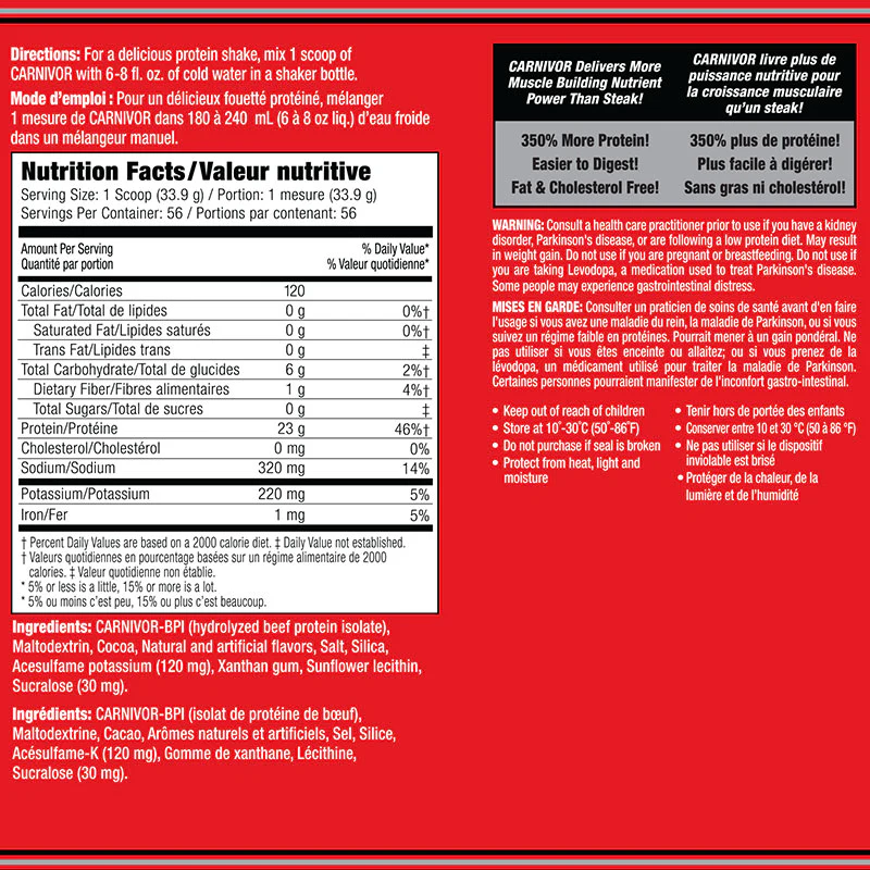 - 23G PROTEIN: Carnivor Beef Protein Isolate delivers all the power of beef with greater amino acid levels than other protein sources. Carnivor features 23 grams of Beef Protein Isolate per serving!