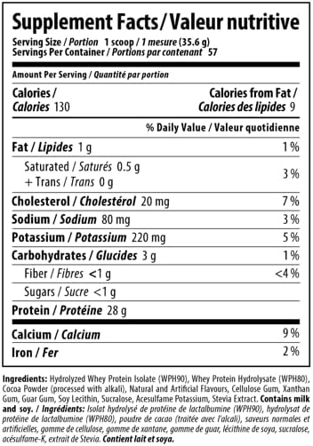 Other Ingredients: Hydrolyzed Whey Protein Isolate (WPH90), Hydrolyzed Whey Protein Isolate (WPH80), Cocoa Processed With Alkali, Natural & Artificial Flavors, Xantham Gum, Soy Lecithin, Cellulose Gum, Sucralose, Acesulfame Potassium, Organic Stevia Extract. Contains milk and soy.