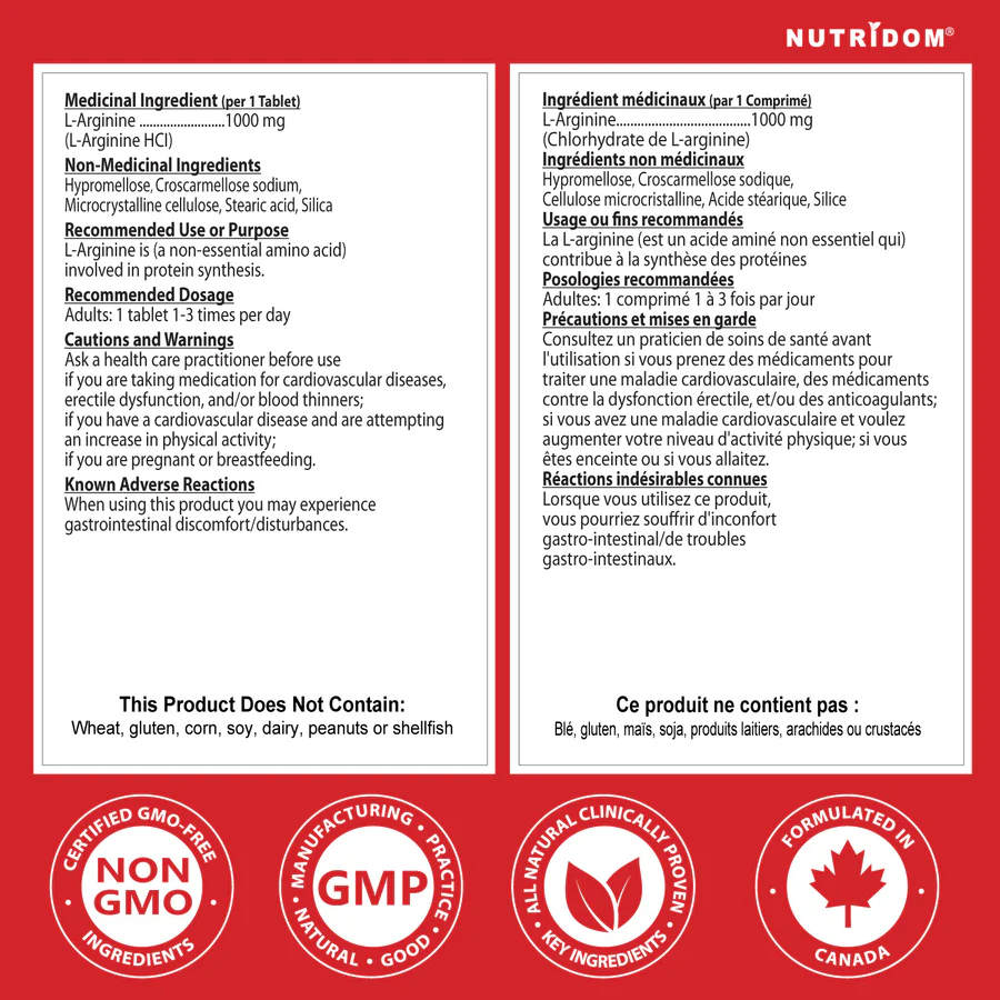 Nutridom L-Arginine provides 1000 mg of free form L-Arginine per tablet, an essential amino acid known as a precursor to nitric oxide. Nitric oxide plays a key role in circulation, nutrient delivery, and supporting an active lifestyle.