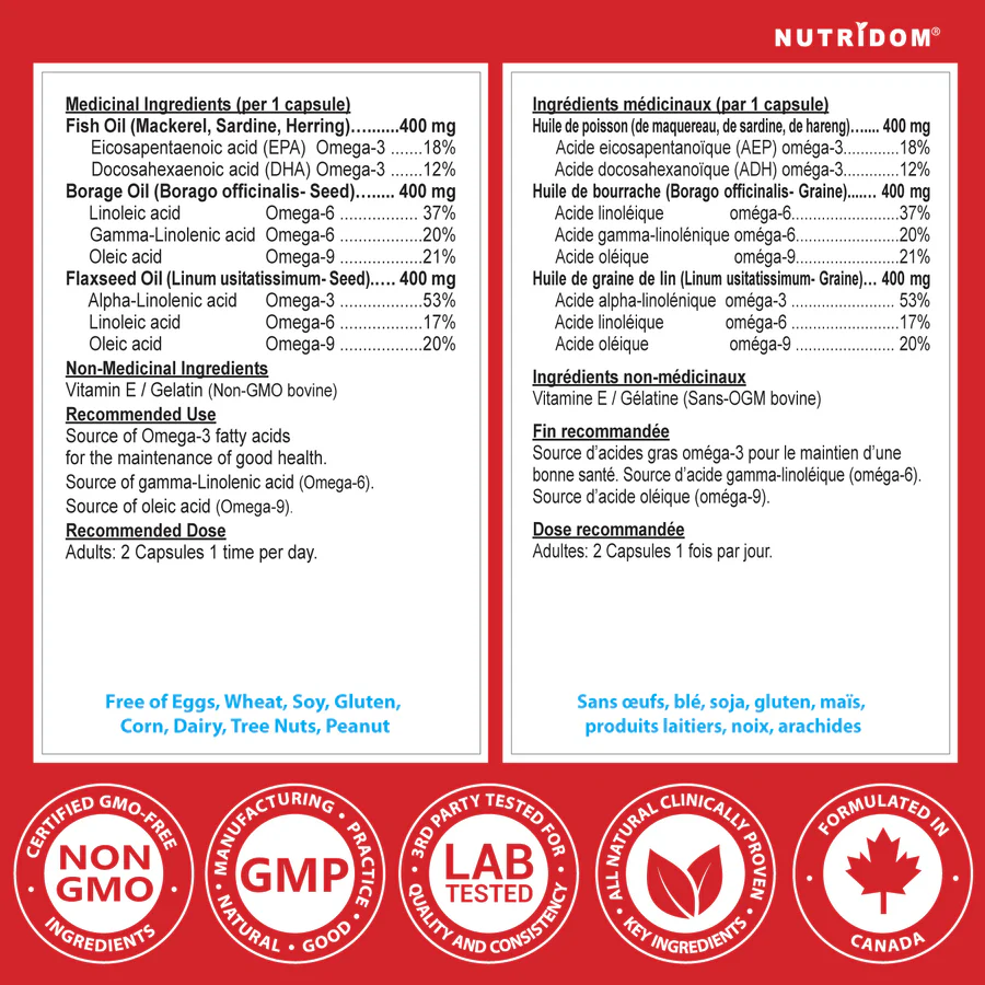 Nutridom Triple Omega delivers a balanced combination of Omega-3, Omega-6, and Omega-9 fatty acids sourced from fish oil, borage oil, and flaxseed oil. This blend provides a convenient way to support overall wellness with daily essential fats.